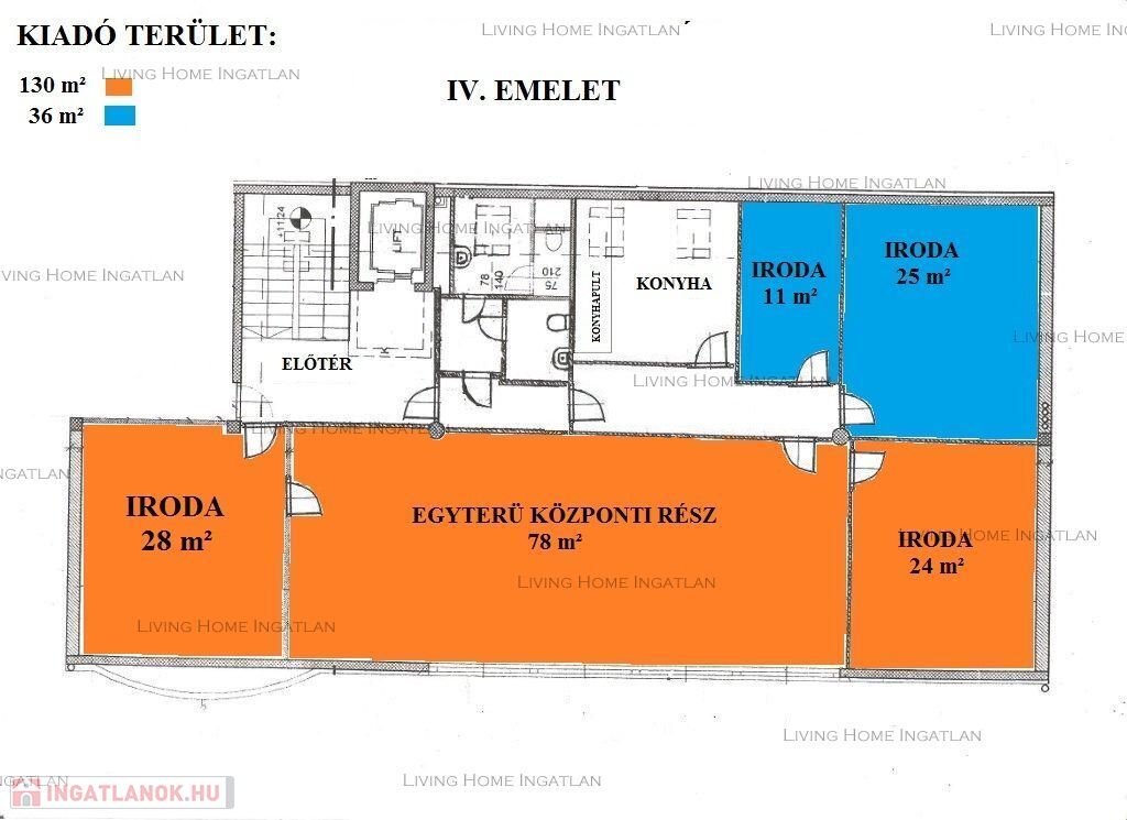 A teljes szinten belül egy vagy több iroda is bérelhető: 60 m2, 130 m2, 166 m2, 202 m2 terület.
